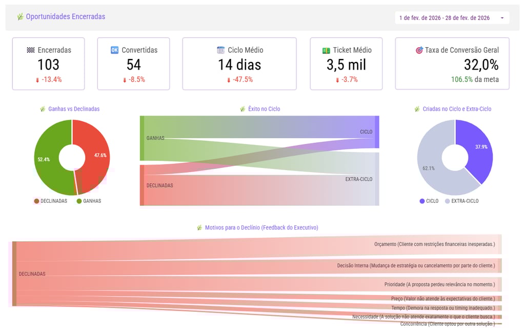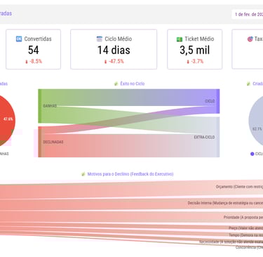 A integração de dados em tempo real traz benefícios inegáveis para a gestão comercial. Com o novo painel de indicadores, é possível monitorar a taxa de conversão geral e o sucesso do ciclo — propostas encerradas durante um ciclo tendem a demonstrar maior sucesso. Além disso, os motivos para o declínio das propostas são facilmente identificáveis, permitindo que as equipes aprendam com as experiências anteriores.